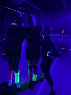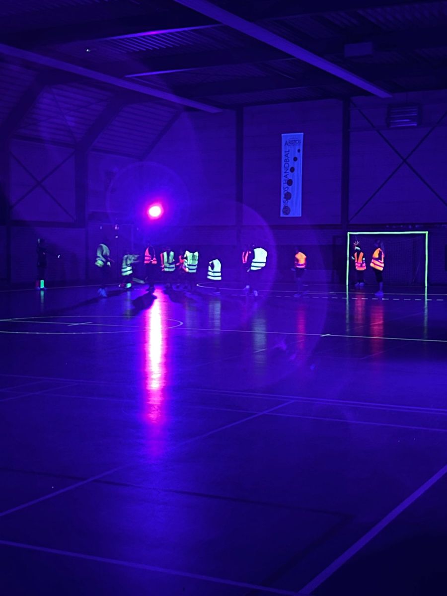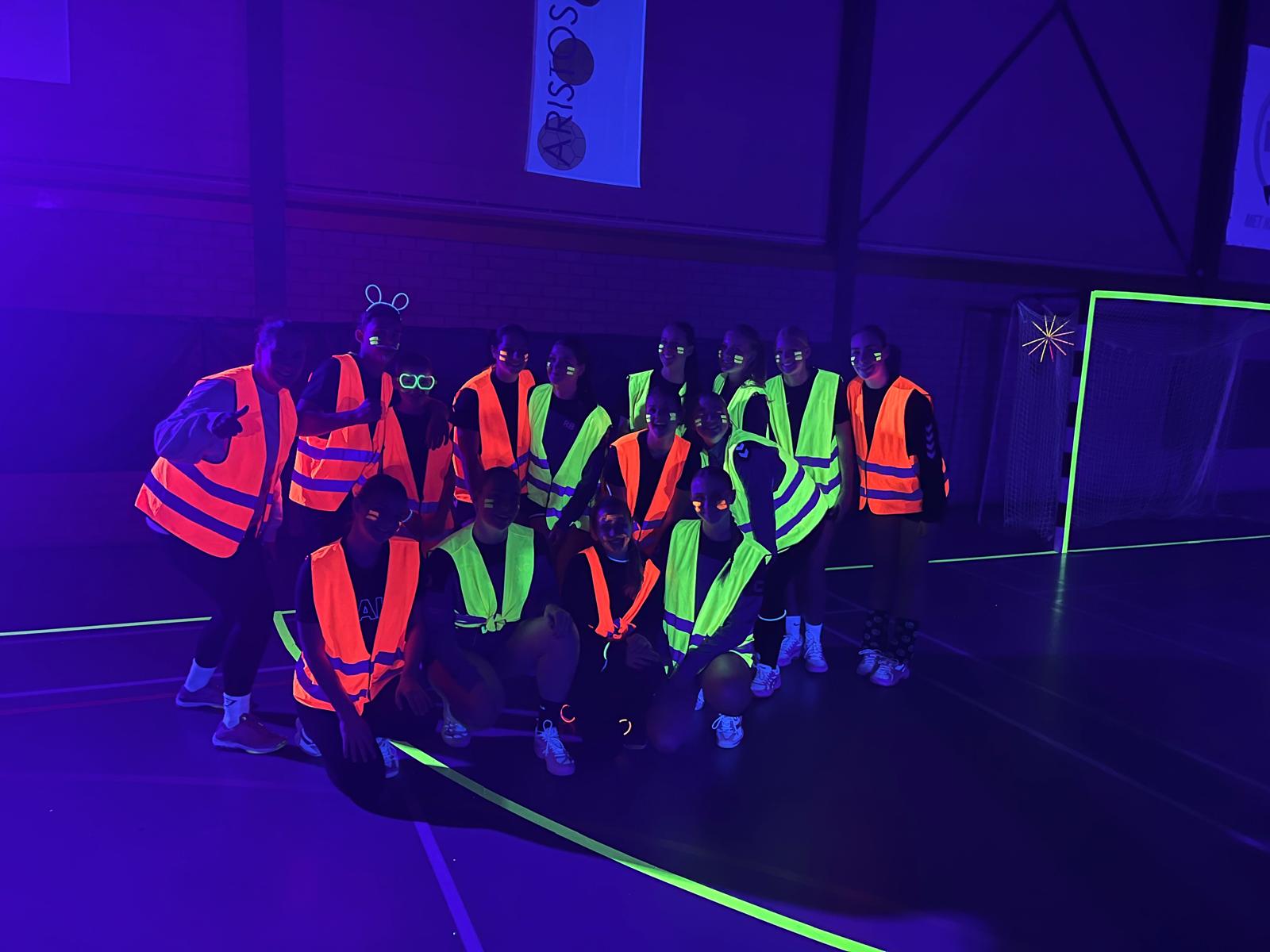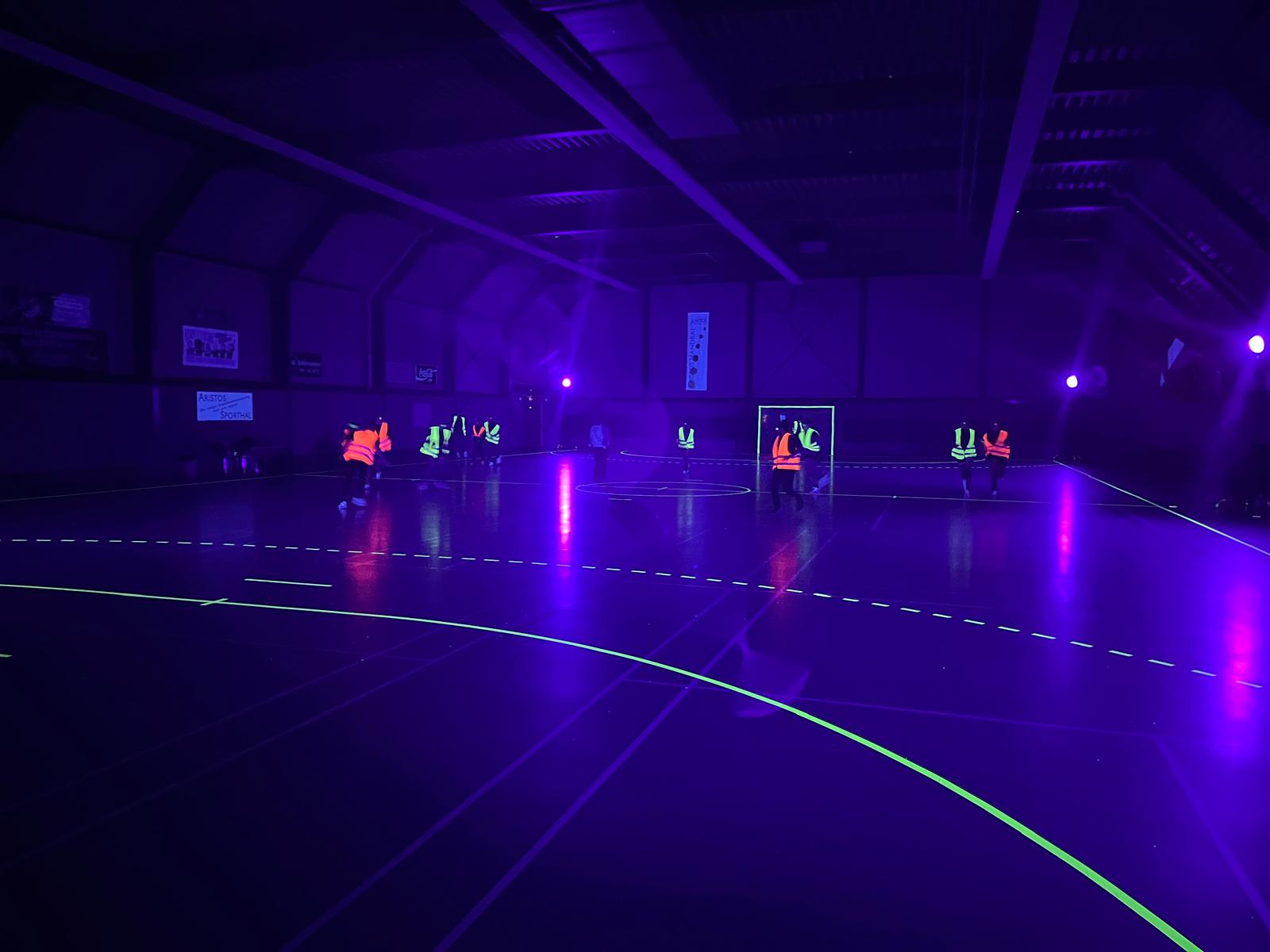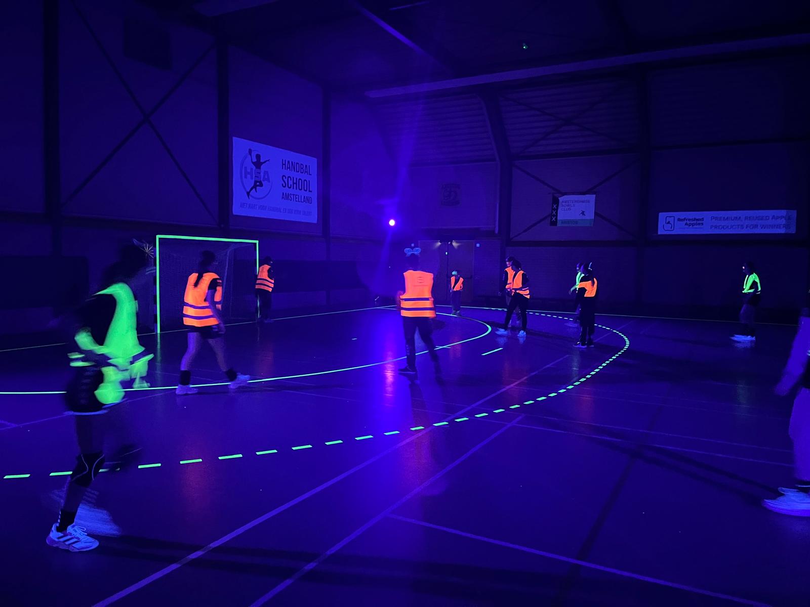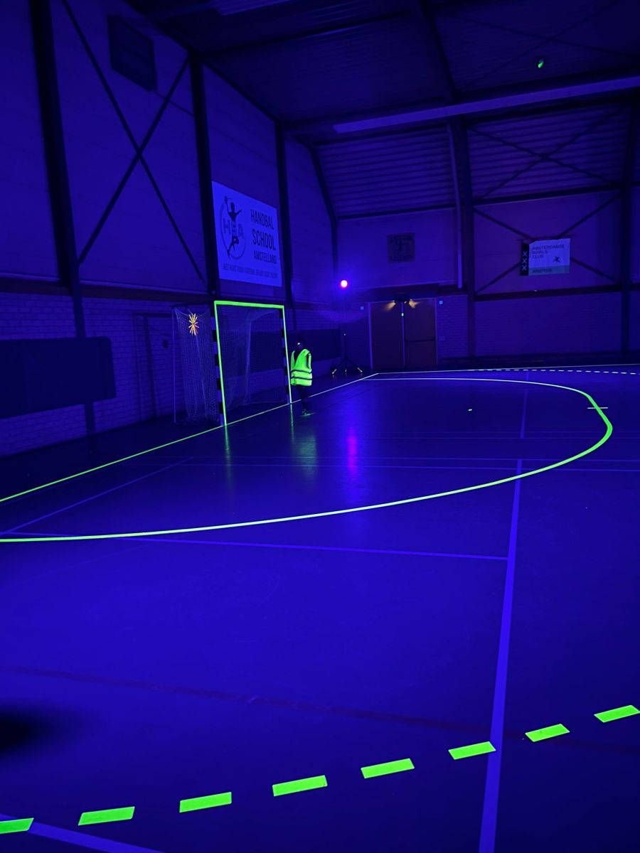 Binnengestapt in een wereld waar handbal en lichtkunst samenkomen! Tijdens het Black Light Handbal evenement in de Aristoshal veranderde de sporthal in een magische arena vol neonkleuren. De lijnen op het veld, de ballen en zelfs de spelers lichten op onder het blacklight, waardoor elke actie een visueel spektakel werd.